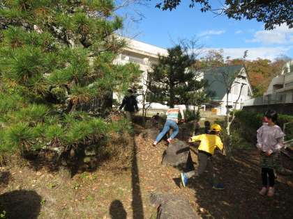 今日も築山で鬼ごっこをします。ウッドランドで遊んだ後なのに、疲れ知らずの子どもたちです。