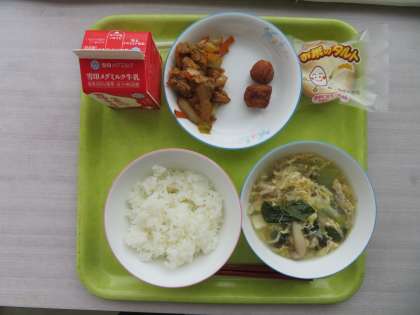 今日のメニューは、ごはん、牛乳、中華風卵スープ、ホイコーロー風野菜炒め、肉団子、お米のタルトでした。