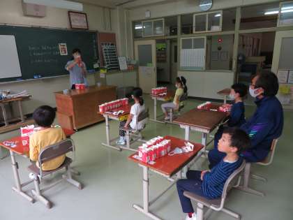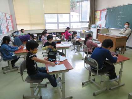 1年生が図工で、たのしいおもちゃづくりの授業をしていました。給食で集めた牛乳パックを使います。3,4年生は学活で、ソーシャルスキルトレーニングをして、振り返りを書いていました。5,6年生は外国語で、過去形の学習です。