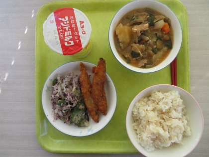 今日のメニューは、玄米ご飯、発酵乳、味噌風味肉じゃが、ししゃもフライ、ゆかり和えでした。