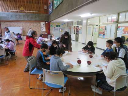 朝の掛川タイムで、収穫して籾すりをした赤米の残った籾殻を取る作業をしました。一人ずつ袋に小分けして、収穫祭の日に持ち帰ります。合わせて講師の先生が赤米でのお赤飯の炊き方を載せた資料も作ってくれましたので、ぜひご家庭で召し上がってみてください。
