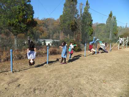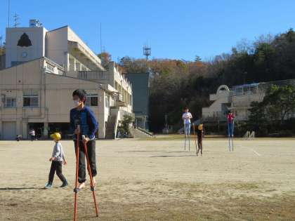 朝は冷えますが、太陽が高くなると暖かく感じます。運動場に出て、鉄棒や竹馬で遊ぶ子どもたちです。