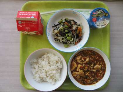 今日のメニューは、麦ご飯、牛乳、マーボー豆腐、ひじきと枝豆のサラダ、ヨーグルトでした。