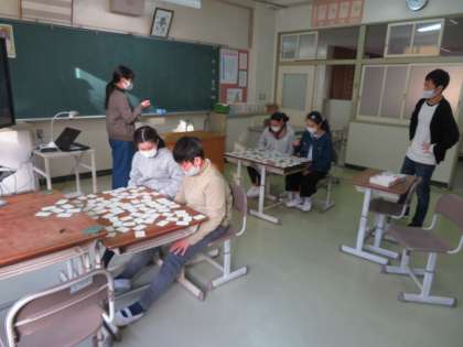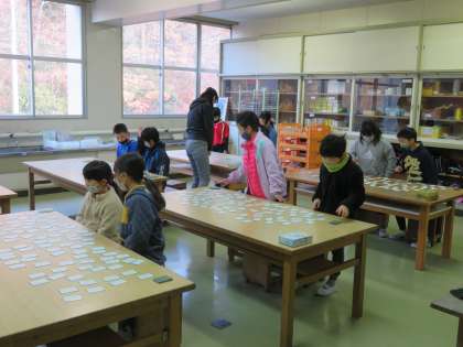 朝の掛川タイムを使って百人一首をする子どもたちです。今年はペアで同じ方向を向いて行います。