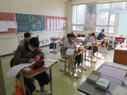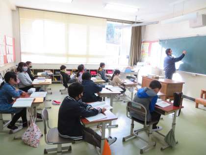 3,4年生が社会で、「木曽三川の治水」について学習していました。6年生は漢字練習です。