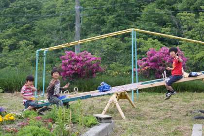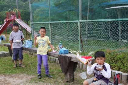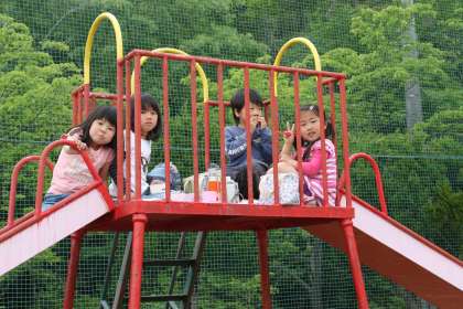 遊具の上で仲良く食べています。