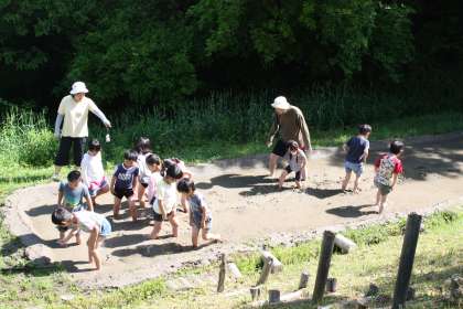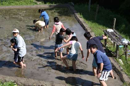 代かきその1 公開日 2010/05/21 更新日 2010/05/21 ふるさとの時間 今日は1時間目に代かきを行いました。晴天で気温も高くなり、絶好?の代かきびよりになりました。地域のボランティアとして下半田川の冨田明朗さんと新井祐達さんに来ていただきました。どうもありがとうございます。初めての1年生の子どもたちも最初おそるおそる田んぼに入っていきました。しかし、だんだん慣れてきて最後にはしっかり泥だらけになりました!