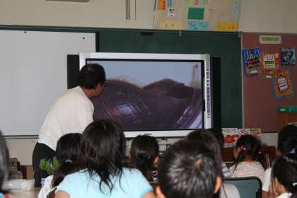 なかよし班ごとにとった川の生き物をバケツに入れました。沢ガニ、カワニナ、ヤゴ、よしのぼりなどがとれました。そのあと、少し深い場所に移動して水遊びをしました。プールのようにもぐる人、水をかけあう人など楽しく遊びました。ふるさとの川はいいですね!学校に帰ってから、図書室で冬木さんが川で捕った生き物の写真を大型テレビを使って見せてくれました。画面に大きくうつった沢ガニやカワニナを見ると怪獣に見えてくるほどでした。最後にサプライズでみんなの遊んでいる動画も見せてくれて、大変楽しい時間になりました!
