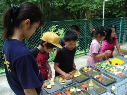 次は、それぞれの動物のエサづくりです。包丁を使って、食べやすいように小さく切りました。
