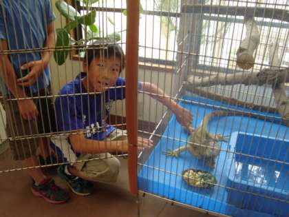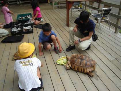 次はエサやりです。カメやモルモットにエサをあげました。おいしく食べてくれましたね。