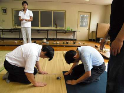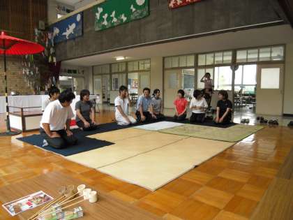 お茶会リハーサル(1) 公開日 2011/07/01 更新日 2011/07/01 今日のスナップ 明日のお茶会に向けて、講師の厳島さんと全員の先生方でお茶会のリハーサルを行いました。子どもを指導するにあたって、先生方もお茶の作法を知ってもらおうというねらいで厳しく指導していただきました。