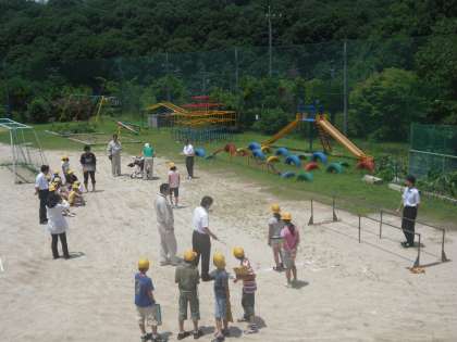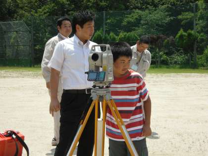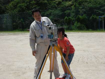 4時間目は運動場に出て、愛知県測量設計業協会の方から、歩いて距離を測ったり、面積を測ったりすることを教えていただきました。また、測量機器を使って正確な距離も測りました。最後に、掛川小学校に素敵なプレゼントをいただきました。それは現在と戦後すぐの航空写真のパネルです。昭和23年の掛川小学校周辺にはほとんど何もなかったのがよくわかります。