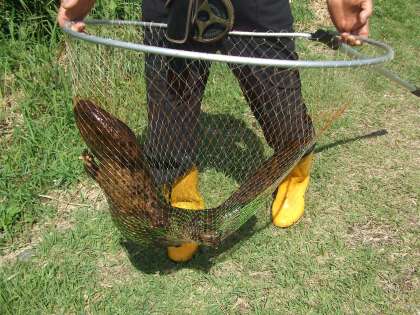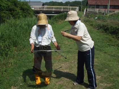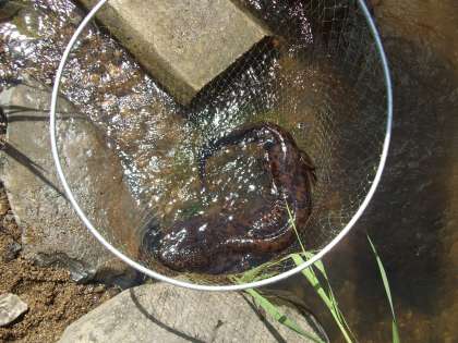 オオサンショウウオあらわる(2) 公開日 2011/07/08 更新日 2011/07/08 ふるさとの時間 つかまえてくださったオオサンショウウオは体長95センチらいの大物でした。子どもたちをすぐ呼んで、目の前で見せてもらいました。本物のオオサンショウウオを生で見るのは先生方も子どもたちも初めてが多かったことだと思います。貴重な体験をしました。このあと、オオサンショウウオは無事元の川に戻され、元気に泳いでいきました。