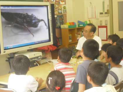 1時間以上川で過ごしましたが、低学年の児童は最後まで集中して水の中の生き物を観察していました。理科が好きな校長先生も子どもと一緒に集中?していますね。学校へ帰り、冬木さんが拡大スコープを使って、大型テレビでつかまえた生物をうつしてくれました。小さな生き物も大きくうつすと怪獣みたいですね。