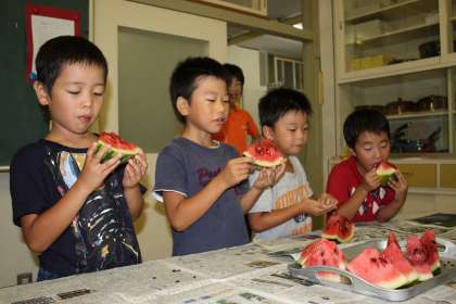 すいかの試食会(1) 公開日 2011/08/19 更新日 2011/08/19 今日のスナップ すいかがたくさんできましたので、子どもたち全員におすそわけがありました。健蔵くんも食べています!みんなとてもおいしそうですね。