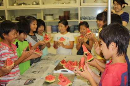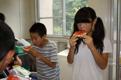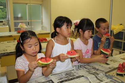 3年生もおいしそうに食べていますね。来年からはすいか畑が増えるかも・・・。