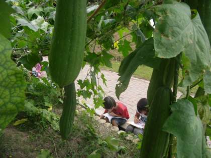 今日は3,4年の理科の授業でヘチマの観察がありました。この夏休みでヘチマがかなり成長しました。観察したあと、実際にヘチマを割って、中の様子を見ました。まだ白くやわらかく、種も真っ白でした。中には食べられると思っている子も?