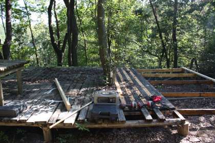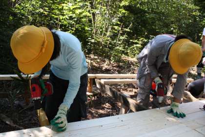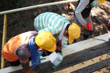 ウッドデッキのリフォーム(2) 公開日 2011/09/15 更新日 2011/09/15 ふるさとの時間 森のテラスに来てみると、長いあいだをかけて板が腐り、冬木さんが板をはずしてくれていました。まるでテレビ番組のビフォアー・アフターみたいになるよ!と橋本先生がみんなに話しましたが、子どもたちはほとんど知らなかったようでした。さっそく修理にとりかかり、5,6年生はドライバーでくぎ打ち。3,4年生は古い木を運び、1,2年生はまわりの伸びた草を切りました。