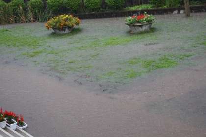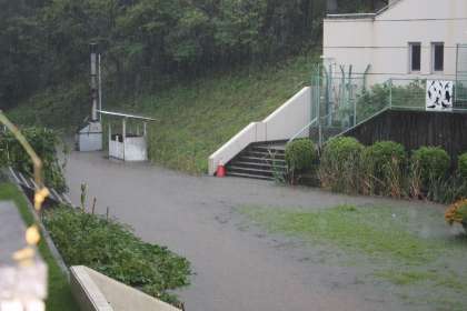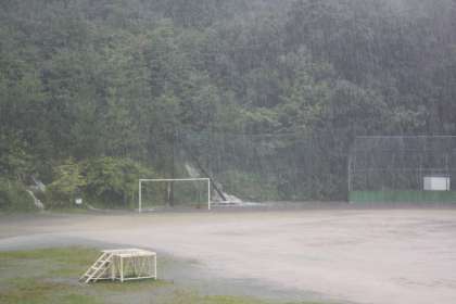 大雨洪水警報(2) 公開日 2011/09/20 更新日 2011/09/20 今日のスナップ 運動場もものすごい土砂降りになり、山からは滝のように水が流れてきました。あっという間に芝生も水に飲み込まれてしまいました。子どもたちには下校の時に、家に帰っても遊びに外へ出ないように、特に川が氾濫しているのを見に行かないように、と注意をしました。