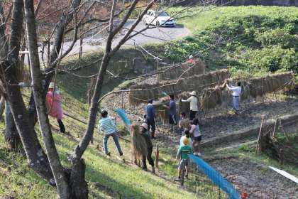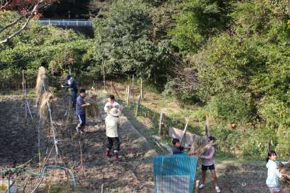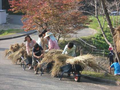 稲運び(1) 公開日 2011/10/12 更新日 2011/10/12 ふるさとの時間 先週稲刈りが終わったばかりですが、さっそくイノシシに侵入されて稲が荒らされていました。またスズメも食べており、地域の方と相談して、少し早いですが稲をピロティまで運ぶことにしました。6時間目に5,6年生のみんなと運びました。(イノシシがこのホームページを見ていなければいいですが・・・笑)