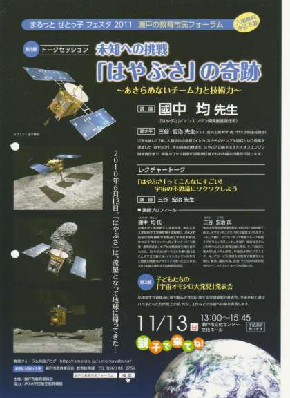 小惑星イトカワからのサンプル回収という偉業を達成したはやぶさ、その旅をささえたイオンエンジンの開発責任者で帰還カプセル回収の現場責任者でもある國中教授のお話を親子で聞いてみませんか。また、第2部では、子どもたちの〜宇宙オモシロ大発見〜発表会も行われます。 *入場無料、申し込みも不要です。ふるってご参加ください。