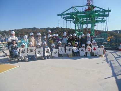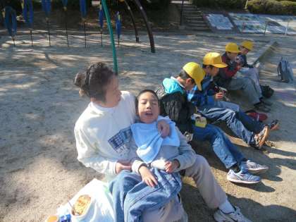 品野台小学校のみんなと記念写真をパチリ!バスの中でバスレクをやって、楽しく過ごしました。友だちができたかな?
