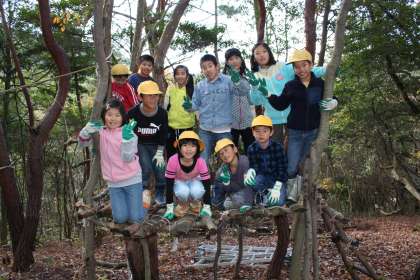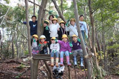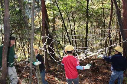 さあ1時間かけて秘密基地づくりが完成しました。あと、冬木さんがハンモックとクモの巣?をつくってくれました。