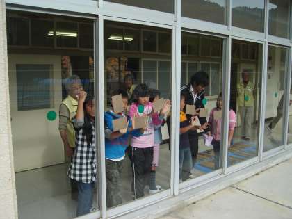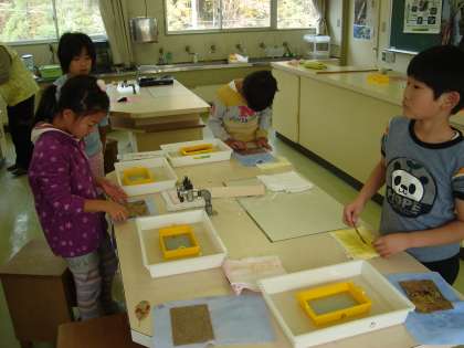次に、グループに分かれて紙すきをして、できあがった紙を窓ガラスに貼りました。明日新聞紙にはさんで乾いたら、バナナペーパーのできあがりです。どんな紙になるでしょう?楽しみですね。