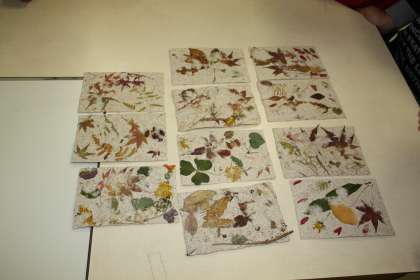 先日のバナナくらぶの出前授業で作った、ハガキ大の紙が出来上がりました。モミジなどの葉っぱをまぜて、とてもいい感じに仕上がりましたね。