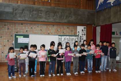 今日は臨時集会がおこなわれ、あさって11日に開催される瀬戸市小学生駅伝大会の激励会がありました。