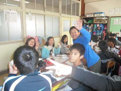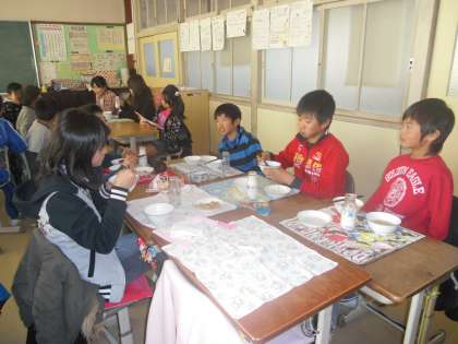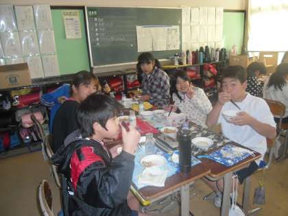 給食風景です。仲良く美味しく食べられたかな?今日の献立は掛川とちがいますね。たくさんで食べる給食はにぎやかです。