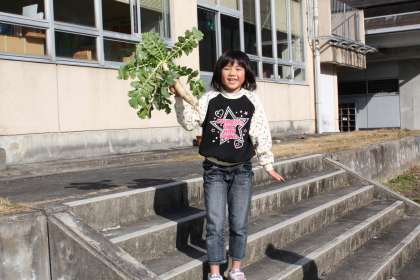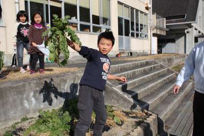 今日は2年生が11月から育てたダイコンを収穫しました。ちょっと種まきが遅かったので、成長もいまひとつでした。しかし、収穫する時は楽しみですね。食べるときっとおいしいですよ!