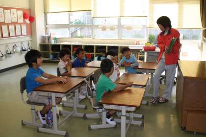 1年生は読み聞かせで本に親しんでいます。2年生は読書に没頭していました。
