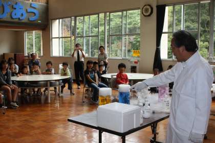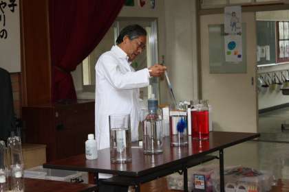 理科実験教室 その1 公開日 2012/10/17 更新日 2012/10/17 今日のスナップ 愛知工業大学から佐伯平二先生を講師にお招きし、3・4時限目に理科実験教室を開きました。子どもたちはどの実験にも目を輝かせていました。透明の水+透明の液体=紫色・・・など不思議体験がいっぱいでした。 【水の色が変わる!?】【ドライアイスでまた変わる】【ペットボトルロケット】