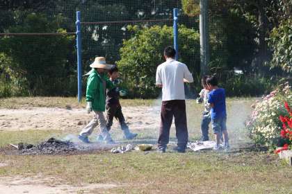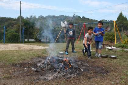 2年生が学級園で収穫したサツマイモを焼き芋にしていました。調理室で大きさを整え、濡れた新聞紙とアルミホイルで包んで校庭の隅で焼きました。全員でおいしくいただきました。秋・・・最高!!