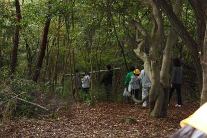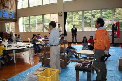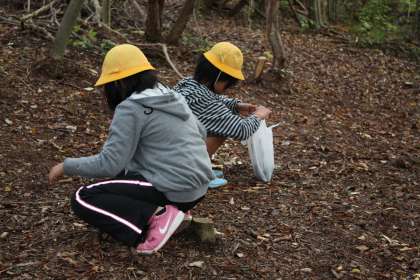 1・2時限目に、学校北側の「遊びの森」で集めた材料を使って『森の工作』をしました。冬木さんと香月さんのお二人を講師にお招きし、材料の加工方法や制作のヒントを教えていただきました。その後、早速森に入り、様々な材料を集めました。そして、1年生から4年生までは檜の間伐材に各自で集めた材料を載せてワンダーランドを作りました。5・6年生は、それぞれ共同で丸太を土台に自然の木を生かした動物を作りました。