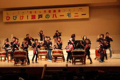 せとっ子音楽会「掛川太鼓」 公開日 2012/11/19 更新日 2012/11/19 最近の行事から まるっとせとっ子フェスタ2012のせとっ子音楽会に参加しました。「えびす太鼓」「ぶちあわせ」「かけがわ八丈」の3曲を掛川小全員で立派に演奏しました。掛川小の演奏が始まった途端、その迫力に会場が一瞬で静まりかえり、演奏後は大きな拍手が起きました。