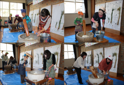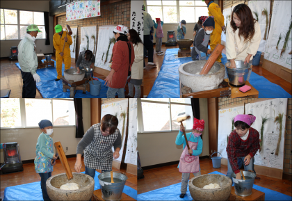収穫祭 その1 公開日 2012/12/14 更新日 2012/12/14 最近の行事から いつもお世話になっている地域の方々47名をお招きして収穫祭を行いました。前日からPTAのお母さん方や地域の方に手伝っていただき、豚汁の下ごしらえや餅つきのなど子ども達も一緒に準備しました。当日も朝早くから大勢の方にお手伝いに来ていただきました。子ども達全員でお餅をつきました。
