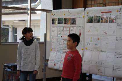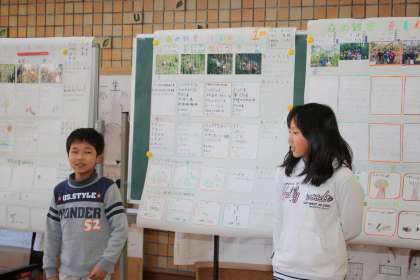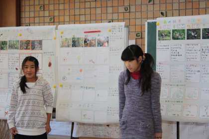 4班の発表の後、2班、3班、1班の順に発表しました。3分にまとめて話すのは、難しいことですが、みんなの前で話すことは貴重な体験です。こうして森の四季を1枚にまとめてみると、いろいろなことに気づきます。