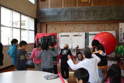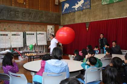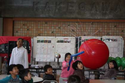 理科実験教室(2) 公開日 2013/01/29 更新日 2013/01/29 最近の行事から 次に、静電気の実験を行いました。静電気の性質を利用してビニールひもを空中で泳がせたり、手をつないで静電気を感じる体験をしたりしました。最後は、液体の性質を利用して風船を割る実験です。大きな風船が登場して、みんなパニックです。 佐伯先生の楽しいお話と、マジックショーのような楽しい仕掛けにみんな大喜びです。理科や科学の楽しさを知るきっかけになったようです。
