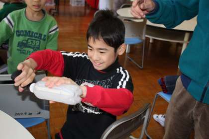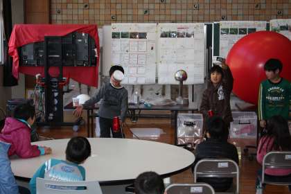 理科実験教室(1) 公開日 2013/01/29 更新日 2013/01/29 最近の行事から 3・4時間目に、愛知工業大学の佐伯平二先生による理科実験教室が行われました。 1年生から6年生までがホールに集まり、様々な科学実験を体験しました。始めは、ペットボトルの中に雲を発生させる実験です。次に、ドライヤーの風の流れを利用して物を空中に浮かせる実験です。浮かせる物を替えているうちに、仕組みがわかってきた子もいるようです。