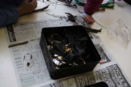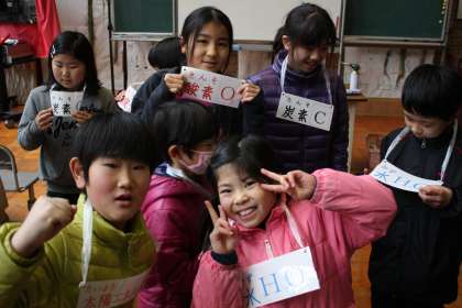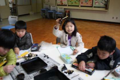 炭焼き体験(2) 公開日 2013/02/07 更新日 2013/02/07 最近の行事から 缶を開ける前に、「炭素」「酸素」「水」「太陽エネルギー」の役の人が移動することで、炭ができる仕組みを教えてもらいました。缶を開けてみると・・・、拾ってきた松ぼっくりや木の枝、折り紙も炭になっていました。子どもたちは、「炭になると軽くなった。」「折り紙の大きさが小さくなった。」と、様々なことに気づいたようです。