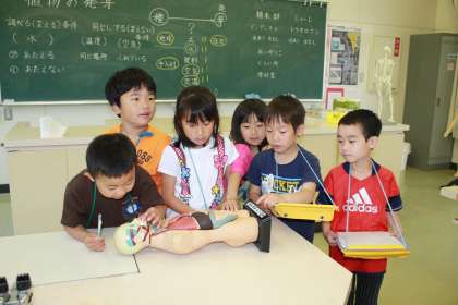 1年生が生活科の授業で、学校の中を探検しました。「はてなをさがそう」をテーマに職員室や校長室、理科室など入ってみたいと思う場所に出かけました。理科室では、高学年が学習に使う人体模型に興味津々です。特別にさわらせてもらって、みんな嬉しそうです。学習カードに、見つけたことがたくさん書けたようです。