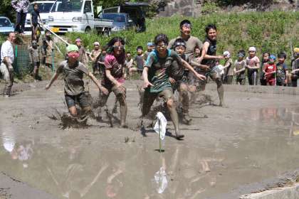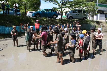 ドロドロドロリンピック(2) 公開日 2013/05/23 更新日 2013/05/23 最近の行事から 例年激しい戦いが繰り広げられる「フラッグ取り」です。高学年の瞬発力はさすがです。先生達も太刀打ちできません。 総合優勝は3班でした。賞品の「手作り笛」を受け取って大満足です。田圃の土もみんなの足でこねられて、元気になりました。この後、地域の方が、田植えに向けて整備してくださいます。本当にありがとうございます。