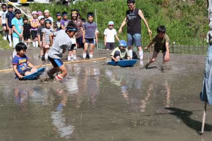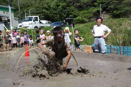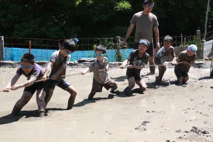 ドロドロドロリンピック(1) 公開日 2013/05/23 更新日 2013/05/23 最近の行事から 今日は「ドロドロドロリンピック」を行いました。田植え前の田圃に入り、代掻きの働きも兼ねて、様々な競技を行いました。まずは、「ソリ引きレース」です。まだまだみんなきれいな顔をしていますね。次の種目は「障害物リレー」です。このころになると、かなりのドロドロです。3番目の種目は綱引きです。チームで力を合わせてがんばります。