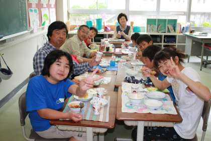 なかよし給食(2) 公開日 2013/05/29 更新日 2013/05/29 今日のスナップ 2班は1年生の教室、3班は2年生の教室、4班は3・4年生の教室で給食を食べました。昨日全校遠足で楽しく過ごしたばかりです。さらに会話が弾んだことでしょう。