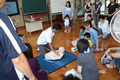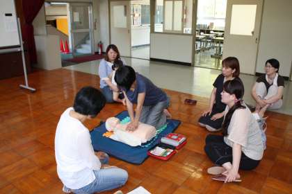 救急蘇生法講習会 公開日 2013/07/09 更新日 2013/07/09 PTA関連 今年も救急蘇生法講習会をPTA厚生部主催で行いました。1分間におよそ100回のペースで心臓マッサージを続けることはとても大変でしたが、AEDを使うための状態を維持することがいかに大切であるかを学びました。