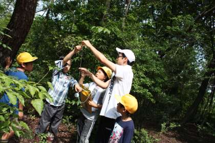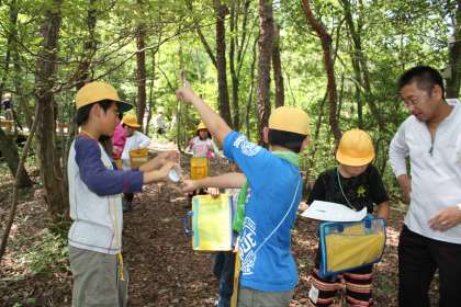 夏の森の学習 その1 公開日 2013/07/16 更新日 2013/07/16 ふるさとの時間 春の森の学習に続き、夏の森の学習を行いました。春に班ごとに決めた「気になる木」の観察を中心に、神明の森の中で夏の様子を調べました。幹の太さを測ったり、巻き尺を使って大まかな測定結果をもとにした木の高さ調べにも挑戦しました。計測した数値を計算式に当てはめて、実際の木のおよその高さや重さを出しました。最後に、図書室に戻って観察のまとめをしました。