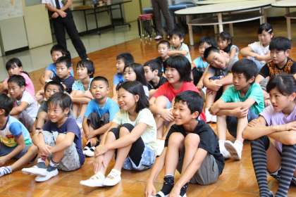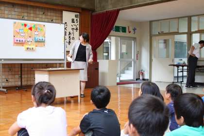 2学期始業式、ホールに全員の元気な顔がそろいました。どの子も日焼けして、一回りたくましくなったようにみえます。