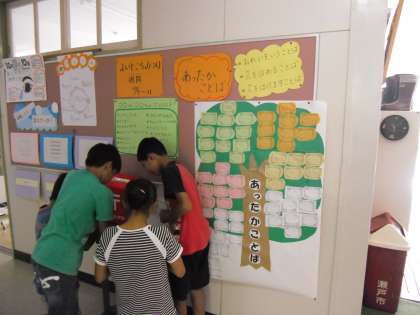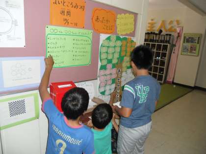 『あったかことば、みつけた』というテーマで子ども達の良いところを見つけ、自己肯定感を高める取組をしています。今週は「よいところみつけ週間」で、友達の良いところを見つけ、用紙に記入してポストに入れています。同じクラスの友達、縦割り班の友達の良いところを見つけます。